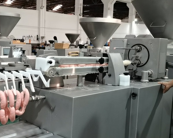 高速扭結(jié)機(jī)和灌裝機(jī)聯(lián)機(jī)實(shí)現(xiàn)自動化生產(chǎn),各參數(shù)可以根據(jù)不同的香腸工藝進(jìn)行設(shè)置。